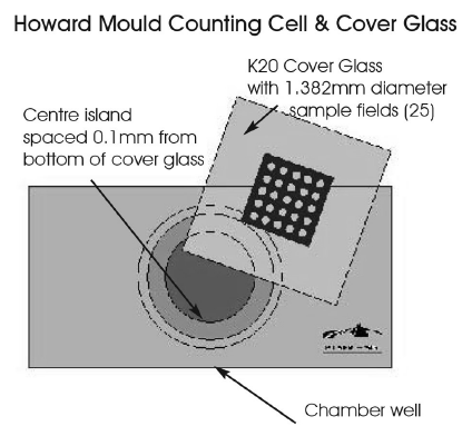 K20這個(gè)蓋片的設(shè)計(jì)很巧妙,35x35mm大小的蓋片中央陳列了25個(gè)直徑為1.382mm的圓形透光區(qū)域,這保證我們觀察一個(gè)區(qū)域時(shí)的視野實(shí)際長(zhǎng)度是1.382mm。這也是霉菌計(jì)數(shù)要求的標(biāo)準(zhǔn)視野大小。