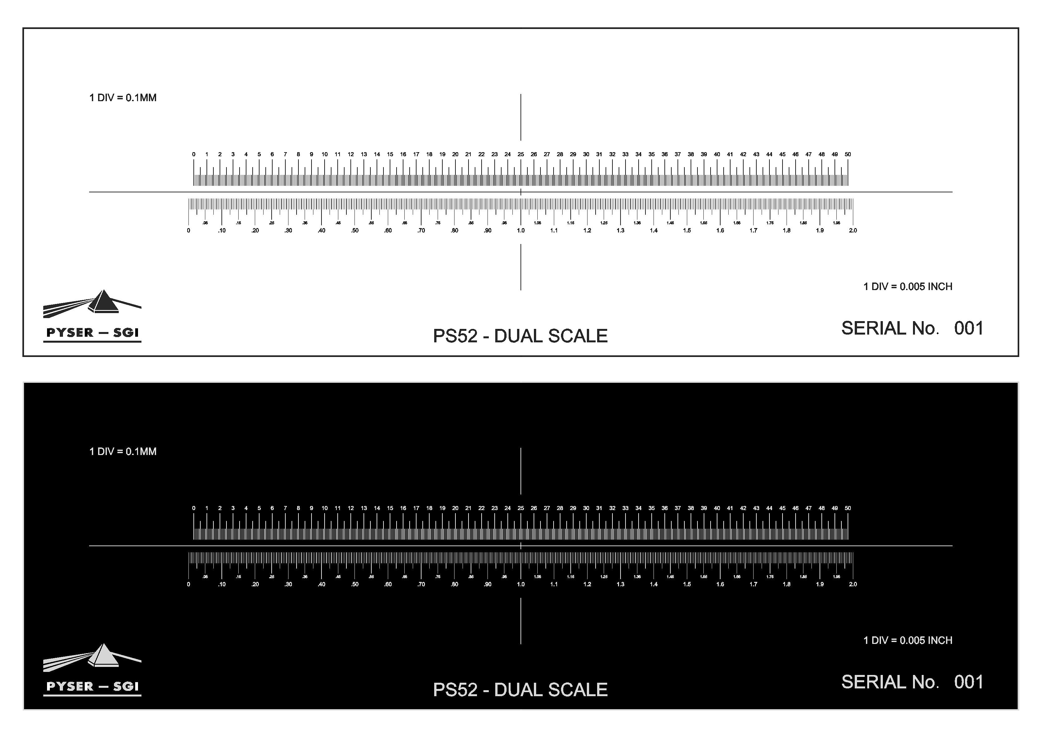 主要用于透射光照明的體視解剖顯微鏡,特別適合大視野范圍的操作或者拍照使用。標準的載玻片的外形,具有唯一產品序列編號可供追溯。同一玻璃尺刻度有英制和公制,正片(positive versions)和負片(negative versions)兩種便于客戶的選擇。產品的示意圖如下: