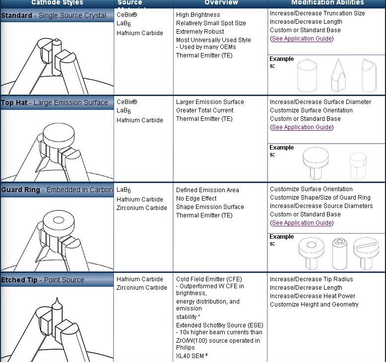 APTECH公司帶給大家四種常見材料的的電子發(fā)射源。熱游離發(fā)射thermal emission (TE)源有六硼化鑭(LaB6)和六硼化鈰(CeBix®)燈絲兩種;場發(fā)射電子槍有兩種:冷場發(fā)射式(cold field emission , FE),熱場發(fā)射式(thermal field emission ,TF),過渡金屬元素常作為場發(fā)射材料,而難熔金屬往往作為冷場發(fā)射源。