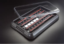 StrainTray的盒體呈黑色,由硬質(zhì)ABS塑料制造,對(duì)廣泛的化學(xué)試劑均惰性(氯代烴類(lèi)除外)。盒內(nèi)支架有四個(gè)橫桿,玻片置于橫桿上,上面再壓上聚酯條,這樣可以很牢固的夾住玻片,盒體即使傾斜也沒(méi)有問(wèn)題。橫桿之間的特殊設(shè)計(jì)可以防止液體飛濺。支架升高可以防水打濕玻片,另外升高的支架可以很方便的拿取玻片。盒體的底部有四個(gè)橡膠墊使其很穩(wěn)固地置于桌面上。盒子和盒子可以疊放,這樣可以節(jié)約很多空間。
