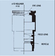 分劃板對潔凈度要求極高,任何微小的灰塵都會在觀測時(shí)產(chǎn)生很大的黑點(diǎn),同時(shí)分劃板的安裝位置精度要求極高,因此,盡量不要拆卸,如果拆卸,一定要按原樣復(fù)原。選擇分劃板直徑必須與待用目鏡相匹配,并且直徑要略小于目鏡。不同的目鏡其分劃板內(nèi)置位置稍有差別。下圖給出內(nèi)置于開涅爾目鏡示意圖:
