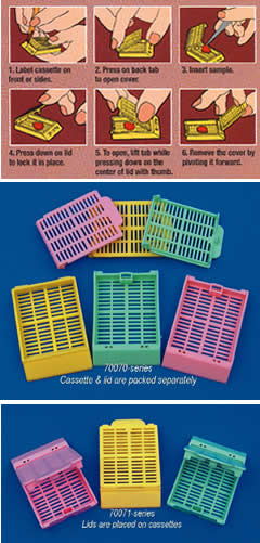 由乙?;酆衔镏谱鞫桑@種特殊的高密度聚合物,能使樣本安全的浸沒在溶液中。包埋盒對大多數(shù)組織溶劑有抗性,盒表面柵格能為液體交換提供最大流量、最適排水。蓋子或者附著在包埋盒上,或者獨立包裝。根據(jù)使用需求蓋子能夠隨時開、合,隨時安全鎖定,不會損傷樣本。包埋盒三面均有較大的空白標記區(qū)域,方便使用。