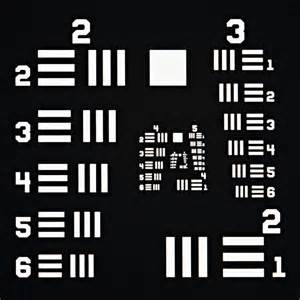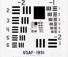 美國空軍1951年分辨力測(cè)試圖一直是世界上檢測(cè)垂直與水平分辨力的通用標(biāo)準(zhǔn),是符合MIL-STD-150A標(biāo)準(zhǔn)的分辨力測(cè)試圖案,由美國空軍于1951年創(chuàng)建。1951 USAF分辨力測(cè)試圖目前仍廣泛地應(yīng)用于測(cè)試光學(xué)成像系統(tǒng)(如顯微鏡和相機(jī))的分辨能力。這種圖案包括幾組由三條短線構(gòu)成組合,短線的尺寸從大到小。成像系統(tǒng)無法辯明的最大短線組為其分辨能力極限。