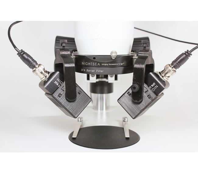 燈使用上可選的配件:燈頭吊架和電纜線。如果覺(jué)得鵝頸燈的角度滿足不了自己的需求,可以購(gòu)買(mǎi)吊架和電纜線,吊架可安裝到SFA適配圈上任何一個(gè)螺釘?shù)哪┒?。燈頭吊架有兩個(gè)不同的樞軸臂長(zhǎng)度,用于長(zhǎng)和短的工作距離。從鵝頸上移除燈頭,裝入吊架,并將其安裝在SFA適配圈上,用電纜線直接連接燈頭和燈座。其實(shí)可以一個(gè)燈座連接雙線電纜,安裝兩個(gè)燈頭和兩個(gè)吊架,你就有雙倍的激發(fā)強(qiáng)度。
