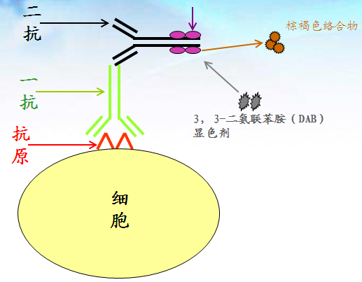 ?? 原理:利用抗原與抗體的特異性結(jié)合原理和特殊的標記技術(shù),通過化學(xué)反應(yīng)使標記抗體顯色,對組織細胞內(nèi)的特異性抗原進行定位、定性、定量檢測的一門技術(shù)。