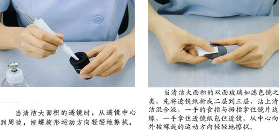 ??? 最好先用吹氣球或者吹氣槍先吹掉表面大的塵土顆粒,結(jié)合軟毛刷輕輕吹刷,因?yàn)檫@些顆粒往往容易劃傷鍍膜層,然后再用擦鏡紙醮取清潔液進(jìn)行擦拭??蓞⒖既缦聢D例所示方法: