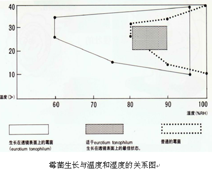 ??? 顯微鏡的光學(xué)表面都有防霉系統(tǒng),各個(gè)廠家都是采用化學(xué)藥品鍍膜防霉,一般有效期大約在78 年左右,超過8 年以后,防霉系統(tǒng)會(huì)失效,此時(shí),應(yīng)該找顯微鏡廠家重新安置防霉片,否則,實(shí)驗(yàn)室條件差的顯微鏡會(huì)開始長(zhǎng)霉,南方潮濕地區(qū)特別顯著,霉菌會(huì)分泌有害物質(zhì)腐蝕玻璃表層的鍍膜層,霉菌密度大時(shí)危害特別大,這樣會(huì)嚴(yán)重危害顯微鏡的光學(xué)性能,因?yàn)殄兡邮枪鈱W(xué)顯微鏡性能的關(guān)鍵所在。上圖是霉菌生長(zhǎng)與溫度和濕度的關(guān)系圖(僅供參考)。